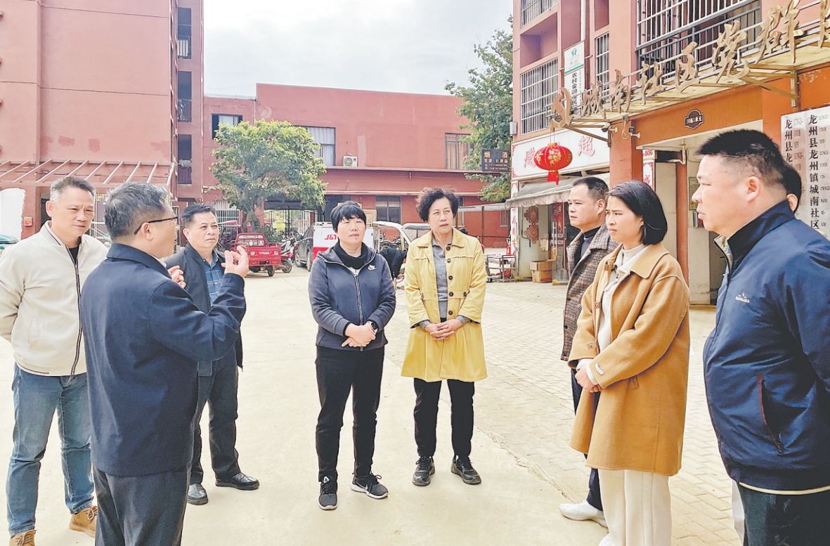 2025年3月18日,市政協(xié)副主席、市工商聯(lián)主席吳愛(ài)紅(左三)帶領(lǐng)委員前往龍州縣城南社區(qū)開(kāi)展“推動(dòng)鑄牢中華民族共同體意識(shí)示范區(qū)建設(shè)”民主監(jiān)督性視察活動(dòng)。