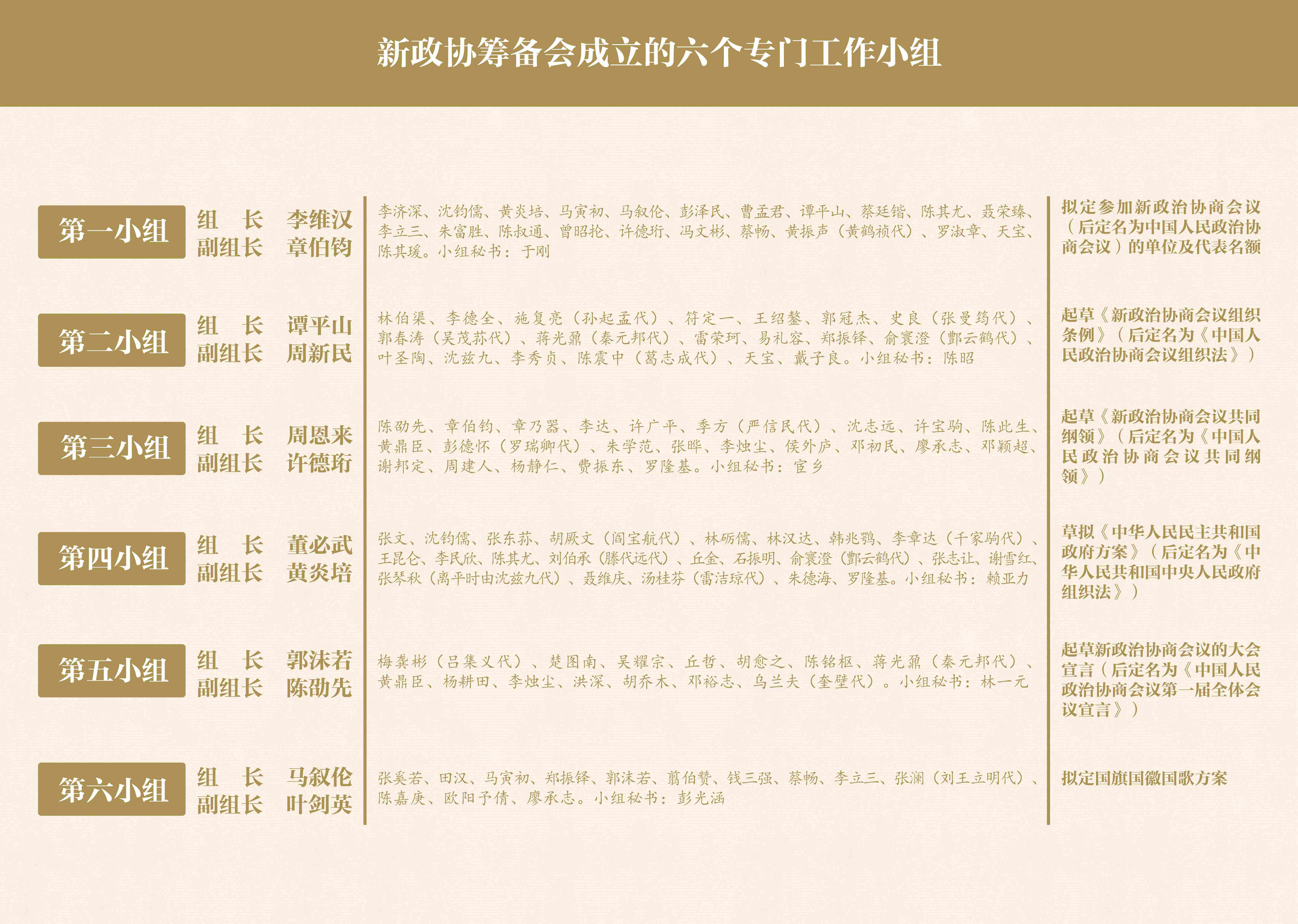 新政協(xié)籌備會下設(shè)六個專門工作小組,在常務(wù)委員會的領(lǐng)導下,分別開展工作。