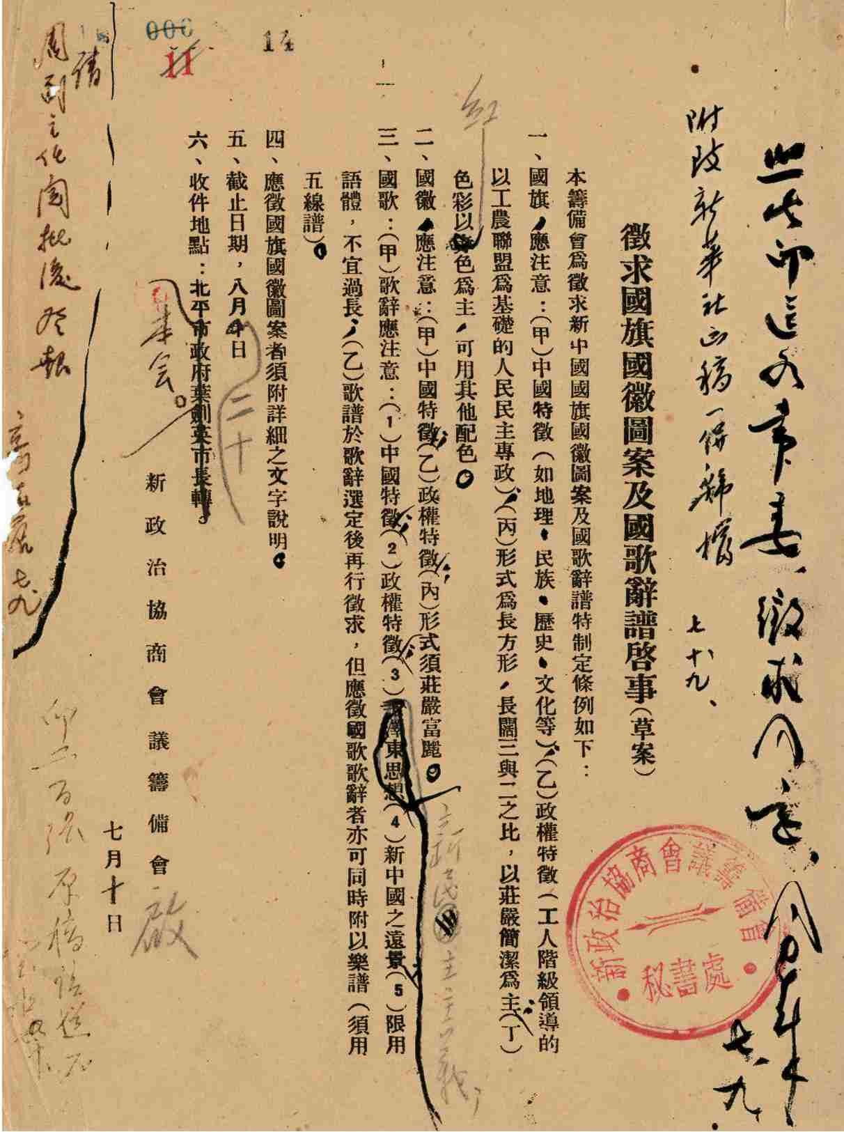 ▲第六小組起草的《征求國旗國徽圖案及國歌辭譜啟事》(草案)
