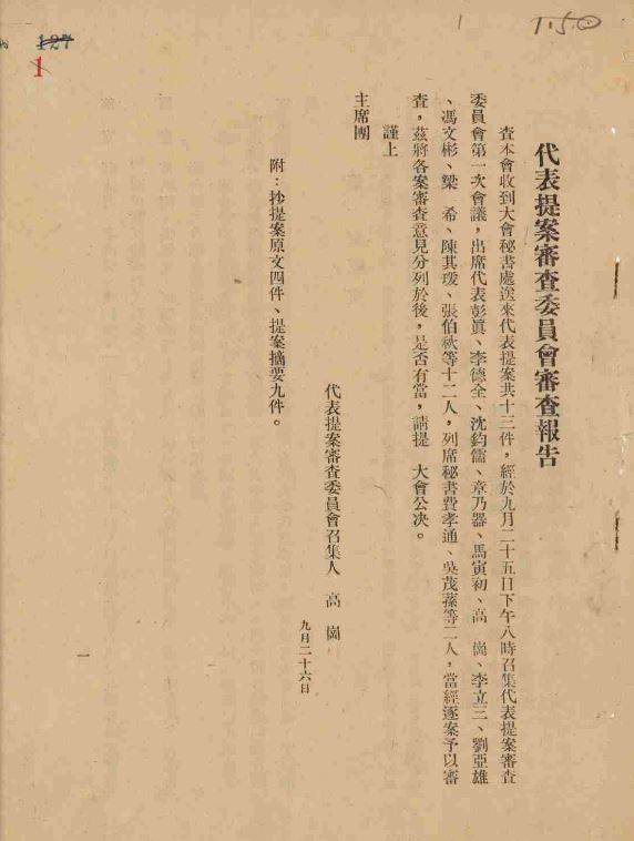因此,大會規(guī)定各單位如有相關(guān)提案,需于9月23日晚前交大會秘書處,再由提案審查委員會加以審查、整理后提交大會。最終,會議共收到代表提案14件,并于9月29日通過了主席團常務(wù)委員會關(guān)于代表提案的審查報告。