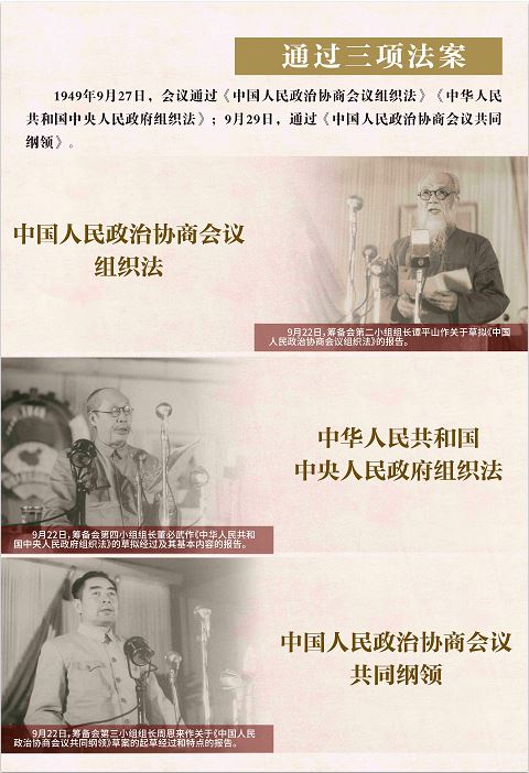 1949年9月17日,新政協(xié)籌備會第二次全體會議審議并基本通過召開中國人民政治協(xié)商會議所必須的重要文件:《中國人民政治協(xié)商會議共同綱領(lǐng)》(草案)、《中國人民政治協(xié)商會議組織法》(草案)、《中華人民共和國中央人民政府組織法》(草案)。