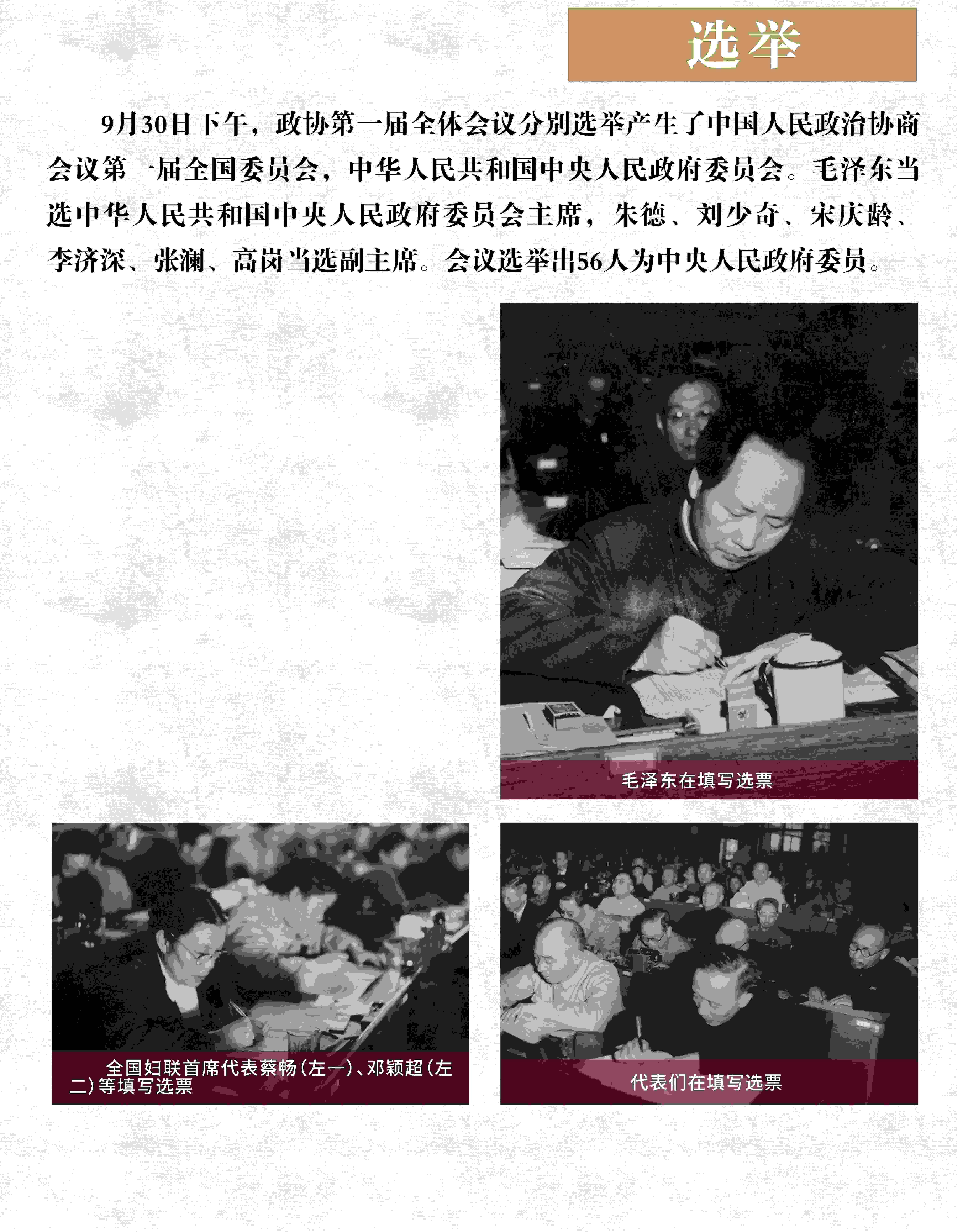 1949年9月30日,政協(xié)第一屆全體會議選舉出中華人民共和國中央人民政府委員會以及政協(xié)第一屆全國委員會,通過了慰問中國人民解放軍電和建立人民英雄紀念碑的決議。中國人民政治協(xié)商會議第一屆全體會議完成全部議程后,宣告勝利閉幕。