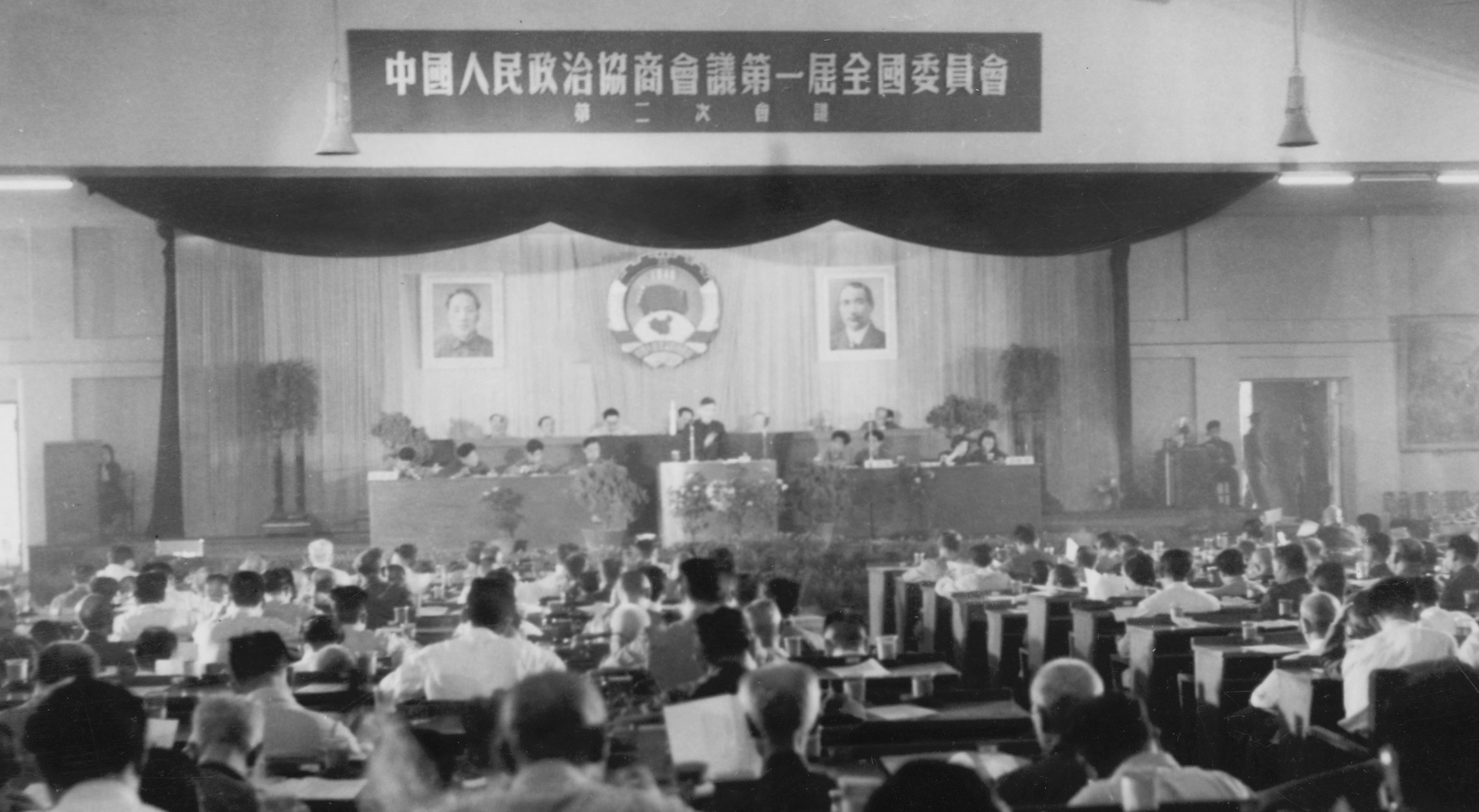 ▲全國政協(xié)一屆四次會議在中南海懷仁堂舉行,毛澤東作重要講話