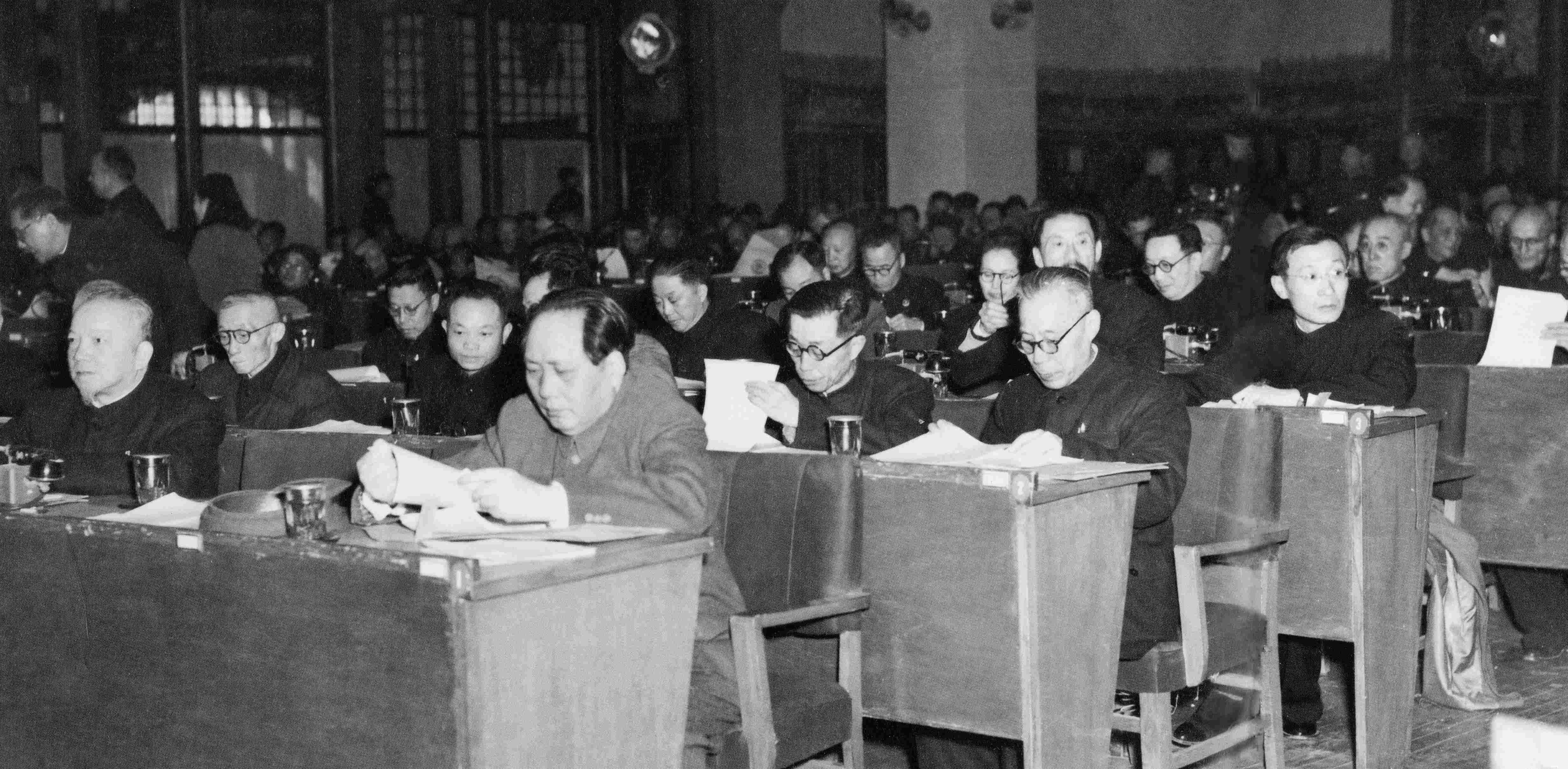 ▲毛澤東、李濟深(前左)等出席全國政協(xié)一屆三次會議