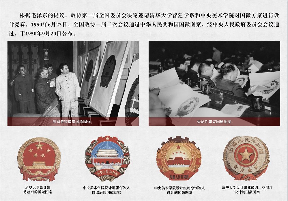 國徽的誕生。根據(jù)毛澤東的提議,政協(xié)第一屆全國委員會決定邀請清華大學營建學系和中央美術(shù)學院對國徽方案進行設(shè)計競賽。1950年6月23日,全國政協(xié)一屆二次會議通過中華人民共和國國徽圖案,經(jīng)中央人民政府委員會會議通過,于1950年9月20日公布。