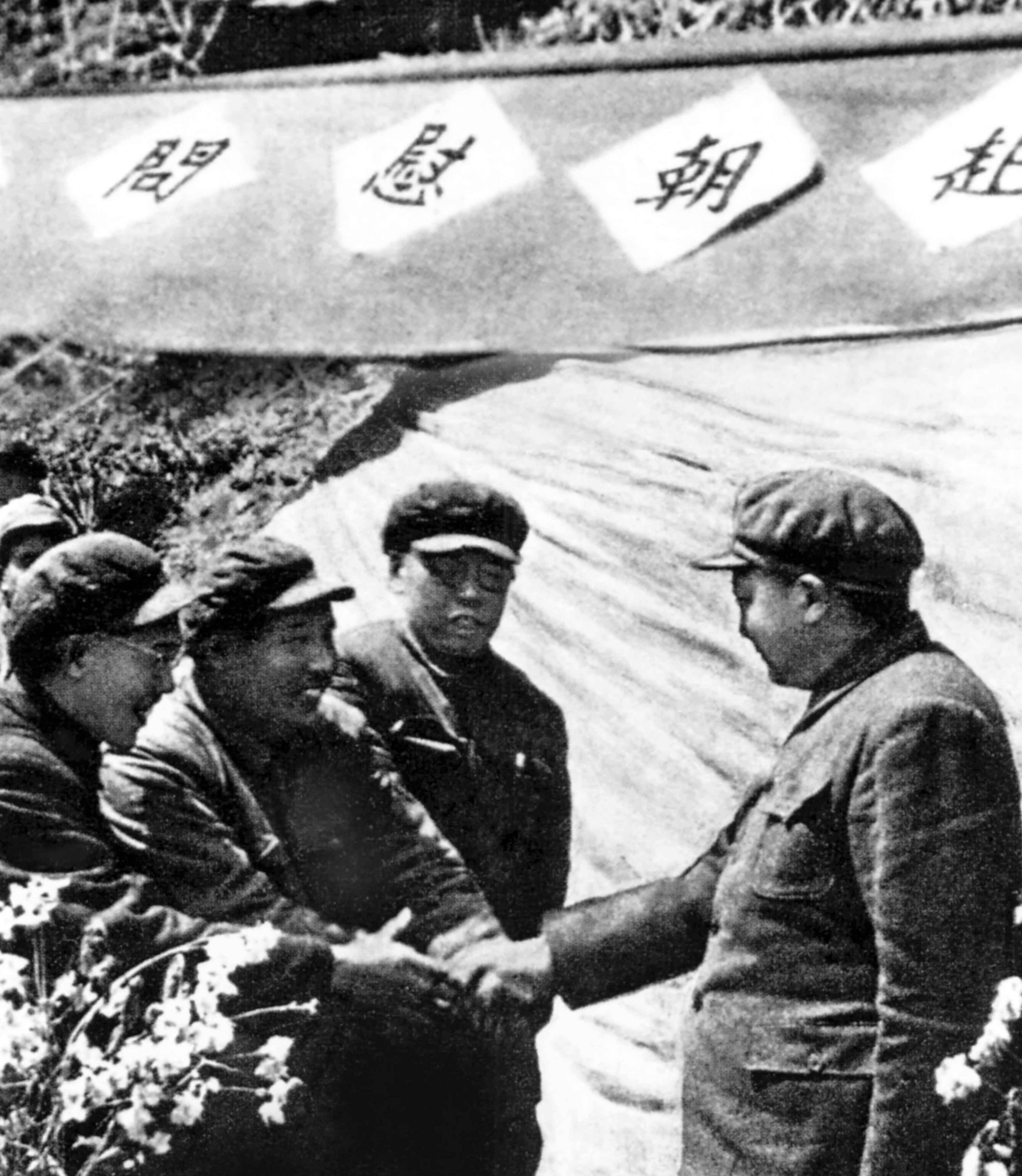 ▲1951年3月和1959年9月,全國政協(xié)會同抗美援朝總會先后派出以廖承志和劉景范為首的中國人民赴朝慰問團。圖為慰問團團長廖承志(左二)、副團長陳沂(左一)、田漢(左三)向中國人民志愿軍彭德懷司令員(左四)獻旗。