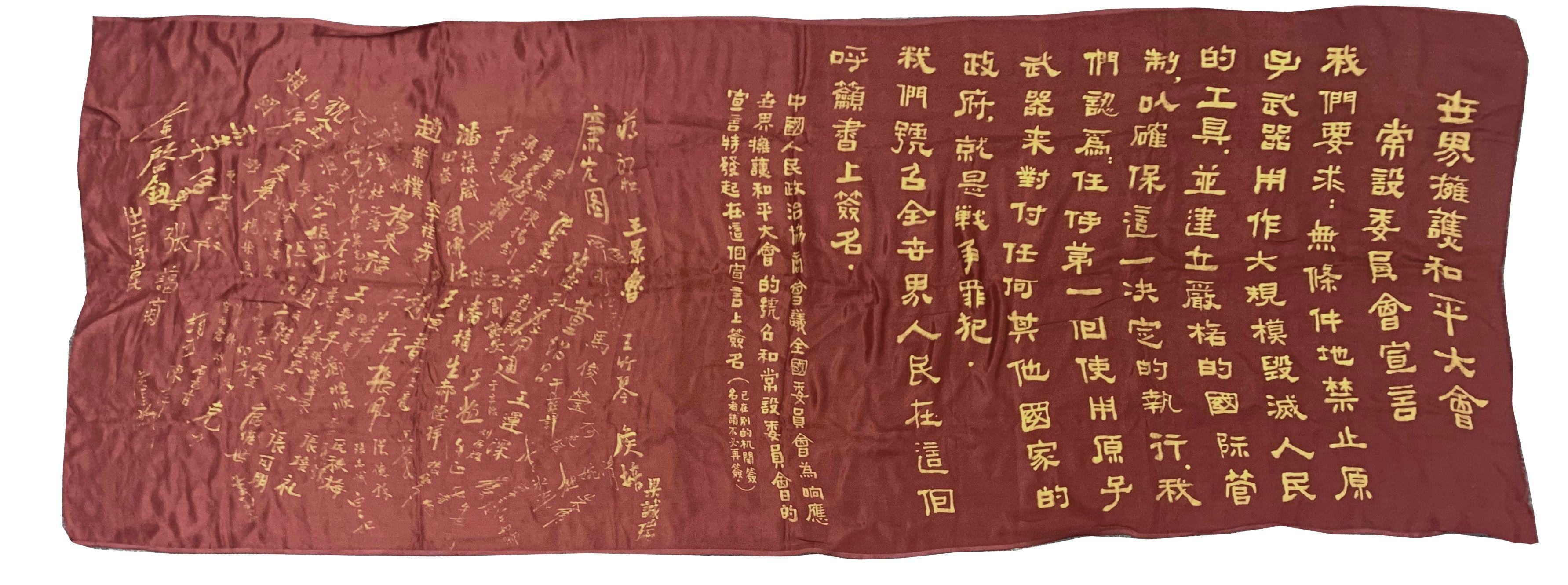 ▲世界維護和平大會常設(shè)委員會宣言及簽名綢