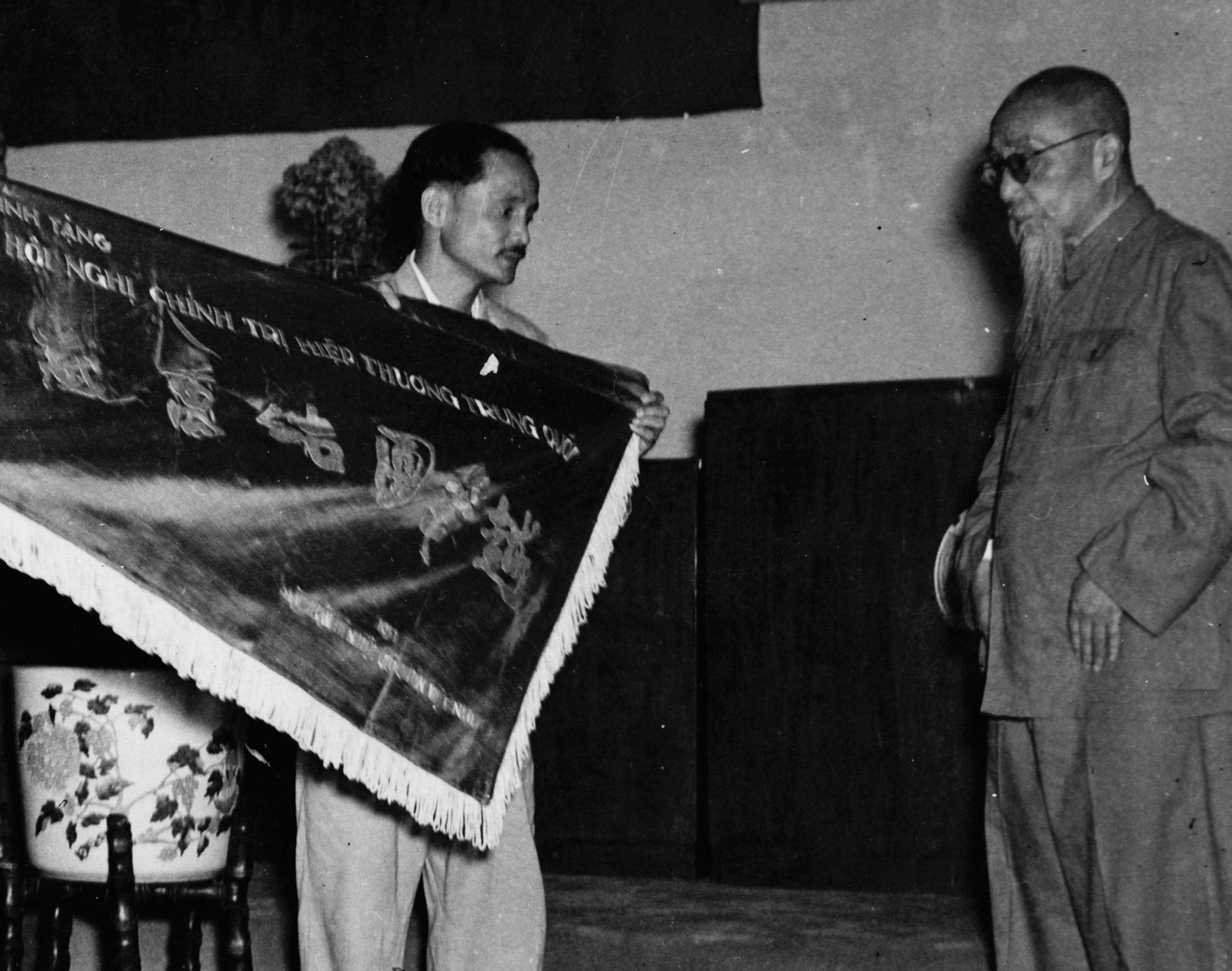 ▲1954年7月,越南人民訪華代表團抵達北京。圖為黃國越團長向陳叔通獻錦旗。