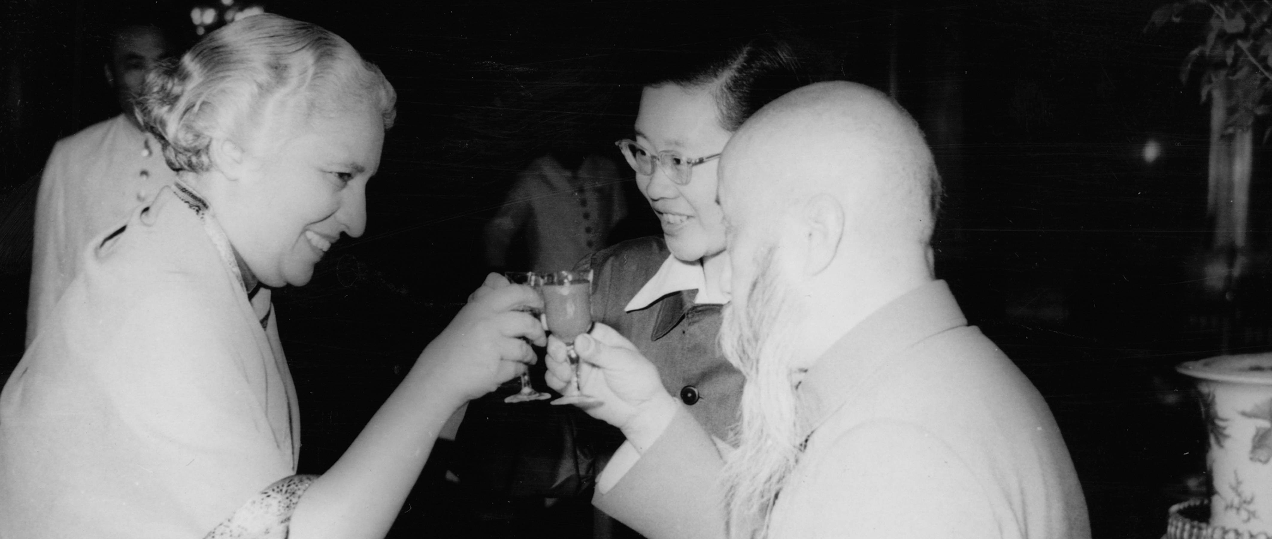 ▲沈鈞儒在招待印度文化代表團的宴會上向團長潘迪特夫人敬酒
